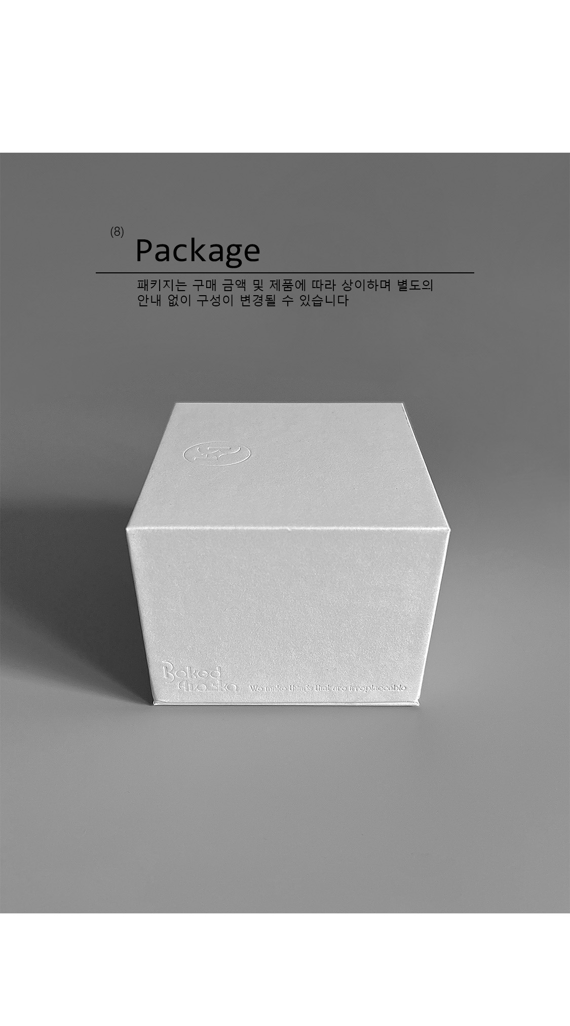 - 수선 및 자세한 사항은 함께 보내드리는 품질보증서 또는 공식 웹사이트 (http://bakedalaska.kr) COSTOMER CARE의 NOTICE에서 보다 자세히 확인하실 수 있습니다.